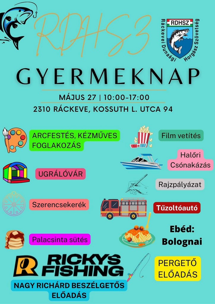 Az ingyenes rendezvényen ugrálóvárral, arcfestéssel, tűzoltóautóval, filmvetítéssel, palacsintasütéssel, pergető előadással, motorcsónakázással és Nagy Richárd (Ricky's fishing) előadásával kedveskedünk az ünnepelteknek. Helyszín: az RDHSZ székház kertje (Ráckeve, Kossuth Lajos u. 94.).