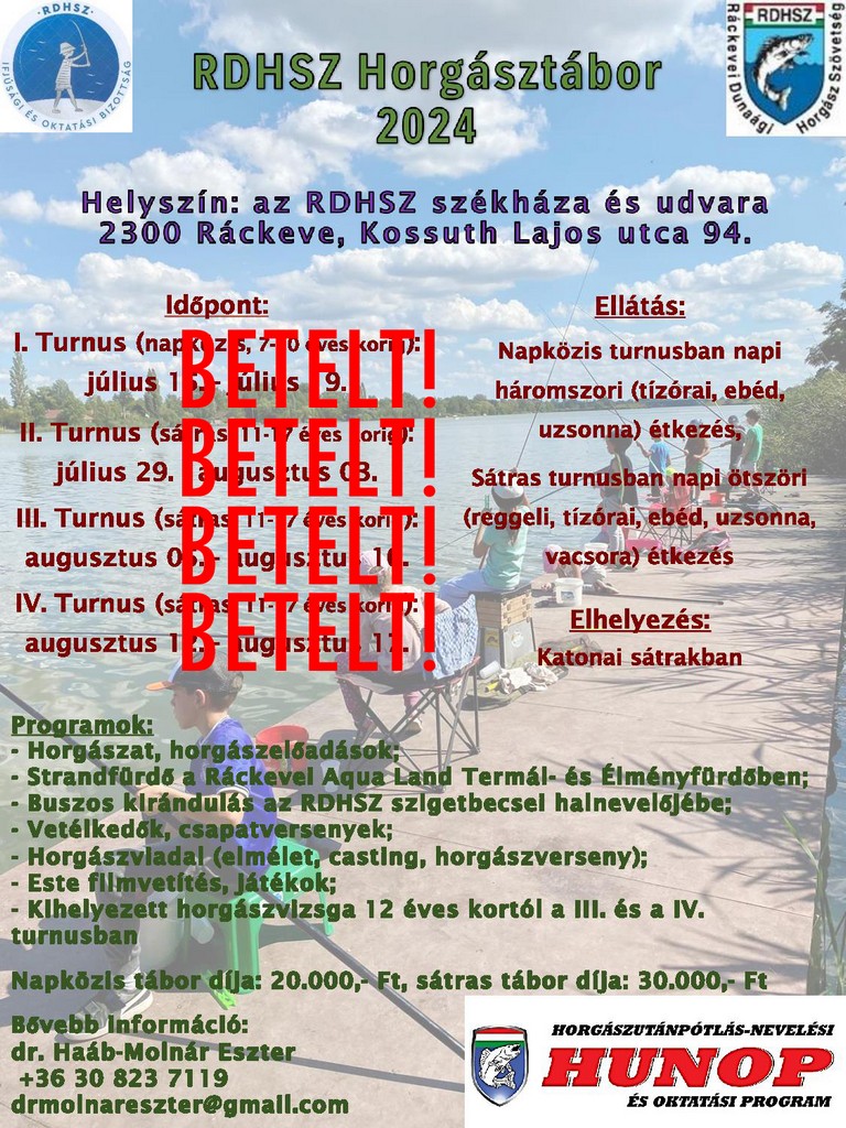 Az RDHSZ gyermek horgásztáboraiba elsősorban tagegyesületeink gyermekhorgászait várjuk, kérjük, hogy a jelentkezési lapokat a tagegyesületi pecséttel és aláírással ellátva megküldeni szíveskedjenek. Természetesen más horgász egyesületi gyermekhorgászok jelentkezését is fogadjuk, de felhívjuk a szülők szíves figyelmét arra, hogy tagegyesületi gyermekhorgászaink a jelentkezési lapok feldolgozásánál előnyt élveznek. Kérjük fentiek szíves tudomásul vételét!